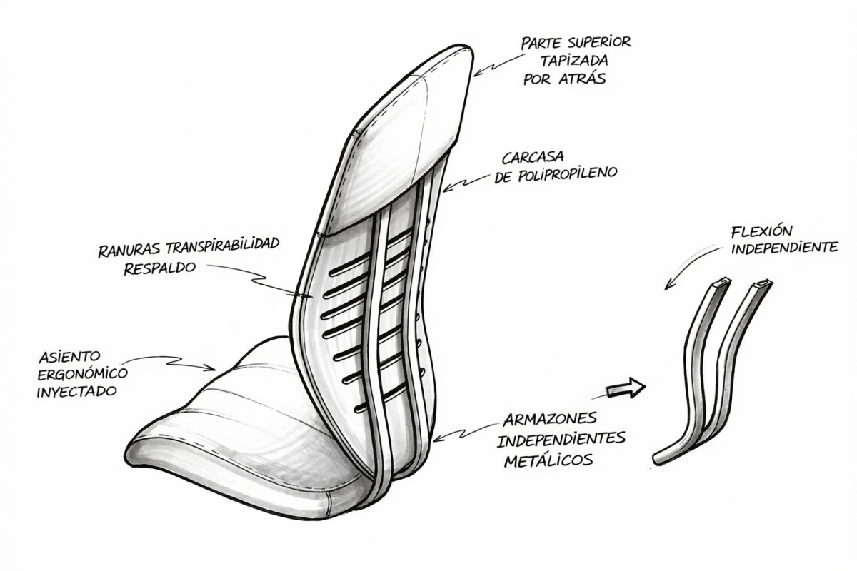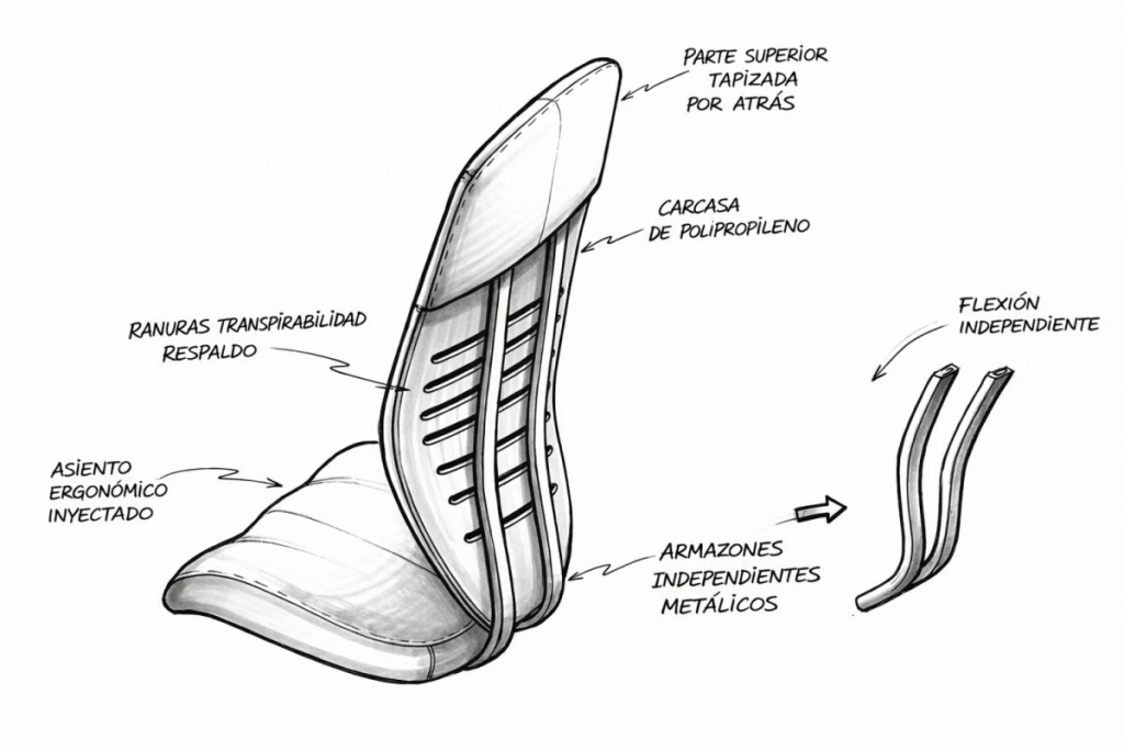 Dispone de un sistema de flexión del respaldo basado en un bastidor metálico que es único en su categoría, puesto que permite la flexión lateral del respaldo sin perder la seguridad que confiere un apoyo rígido del mismo.