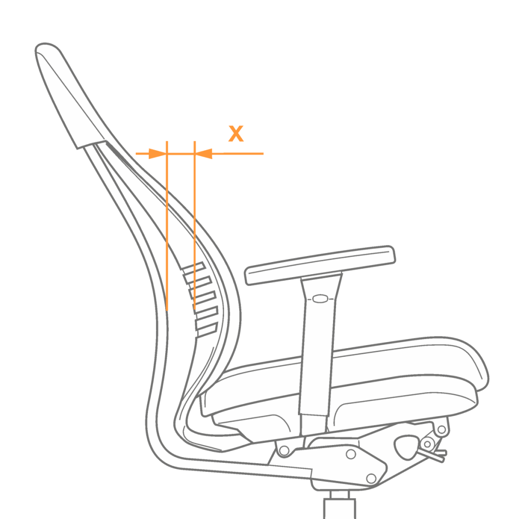 Gracias a su novedoso respaldo flexible, logramos que el apoyo lumbar sea más prominente a medida que el usuario se inclina. El respaldo se va curvando en la parte inferior (aumentando la distancia X), adaptándose así a la forma que va adquiriendo la espalda.