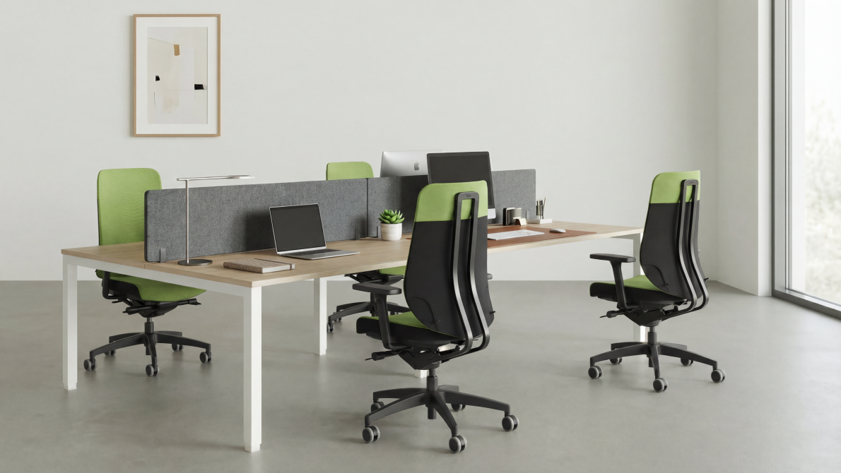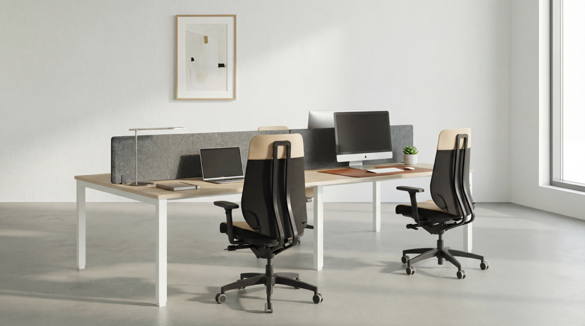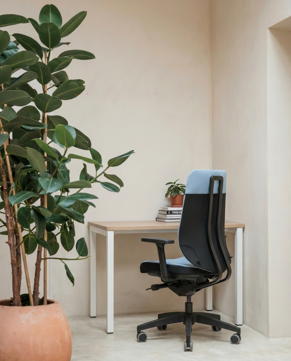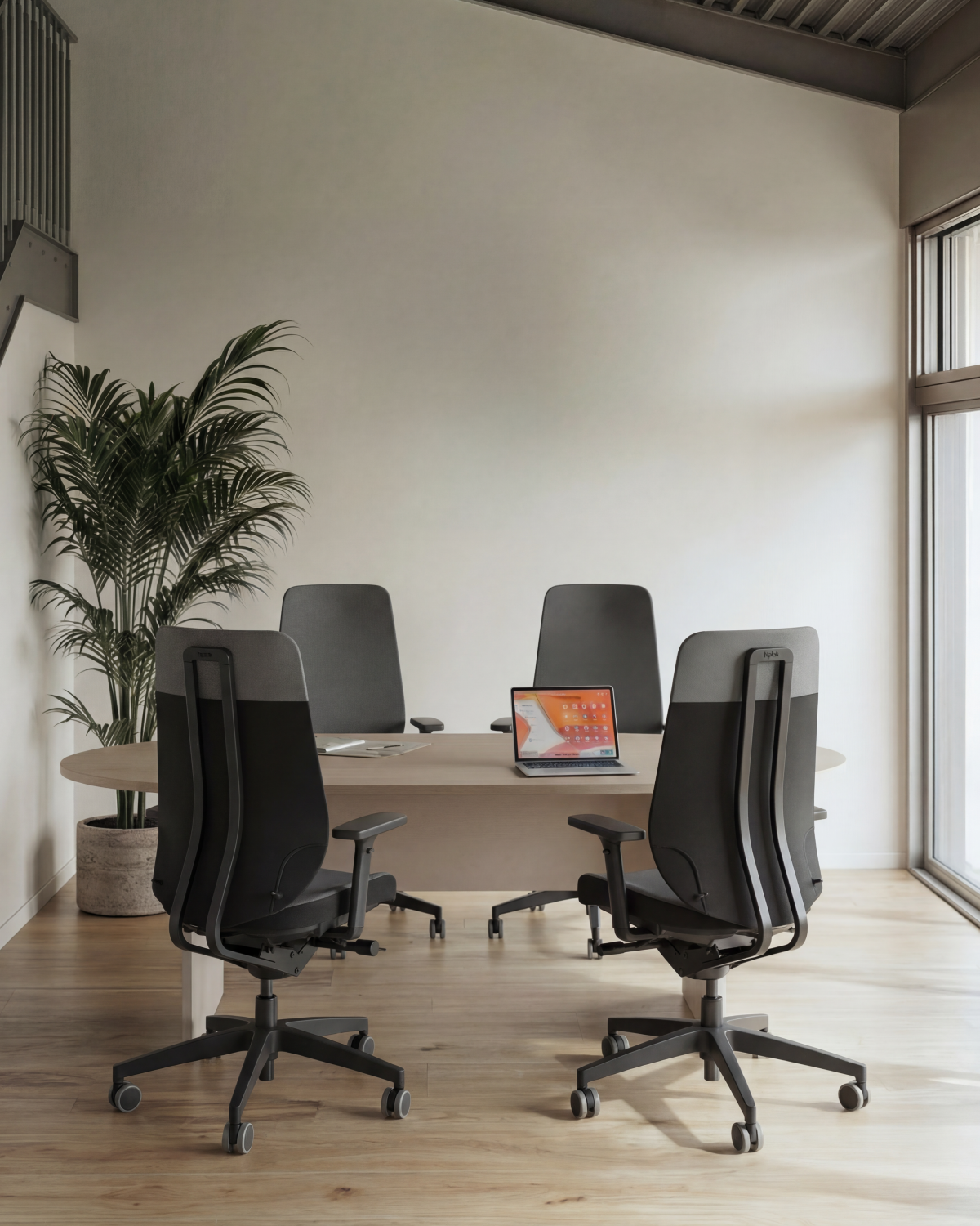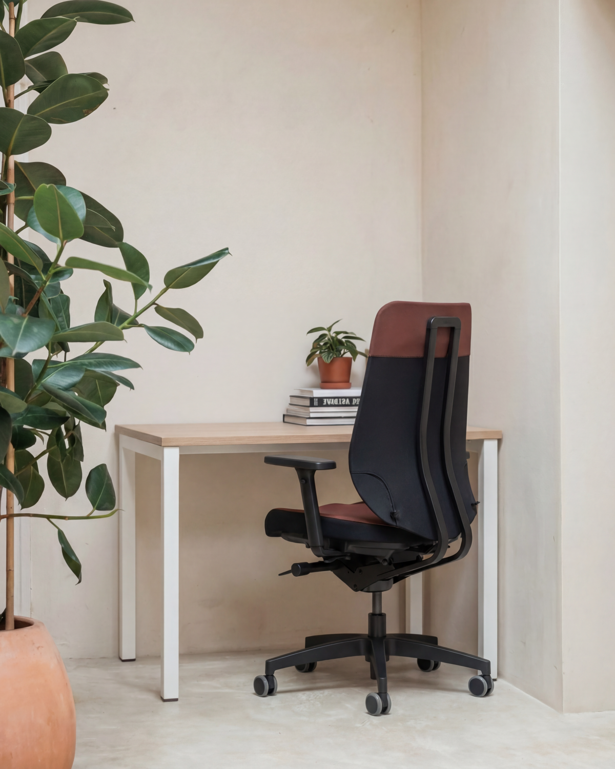 Incluye una base de 5 radios fabricada en poliamida. El armazón trasero presenta un elegante acabado en negro mate, aportando una estética sobria y profesional.